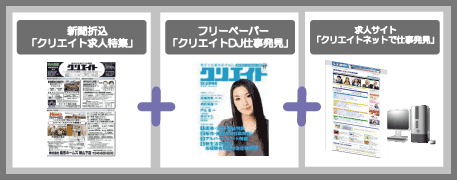 | 折込は新聞を購読している世帯にはほぼ折り込まれるので、手元に届くという点では他媒体に比べ、有効といえます。また、クリエイト求人特集に掲載すると、クリエイトの求人サイト+フリーペーパーにも同時搭載されるので求人3媒体に訴求をかけることが可能です。 ※2009.9.28号をもって「クリエイトDJ仕事発見」は休刊 |