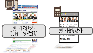 | クリエイト求人特集へ広告掲載をすると、クリエイトネットで仕事発見(クリエイトの運営するインターネット求人サイト)へ無料転載されます。パソコン・ケータイ版への情報転載サービスにより紙面以外からの読者も獲得できます。ですので、クリエイト求人特集全地域の情報はパソコン・ケータイから見ることが出来ます。 |