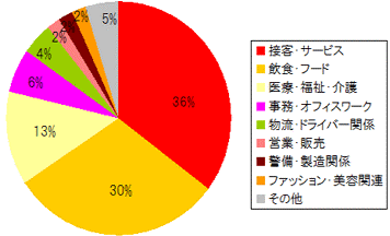 | 接客・飲食系の仕事で6割以上を占めています。 紙媒体では医療・福祉関連が5割以上を占めていましたが、インターネット媒体ということもあり、 やはり媒体によって募集職種を使い分けているようです。 |