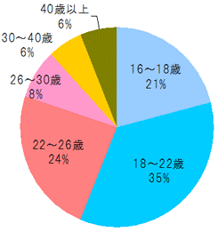 | ジョブセンスを男女別に見ると、51%:49%とほぼ半々という状況です。 年齢層別では、10代が20%で70%が20代、つまり20代までで9割を占めるユーザーになります。 若年層に特化した職種、飲食店のホールスタッフや学生をターゲットとした家庭教師などのターゲット層には最適と言えます。 |