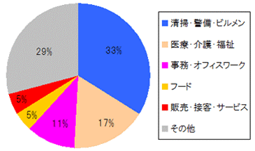 | 清掃・警備・ビルメンの仕事が30%を超えています。2番目に医療・介護の仕事が来ていることからも、地域密着型の媒体=地元での採用、を軸とする職種が多く掲載されています。 |