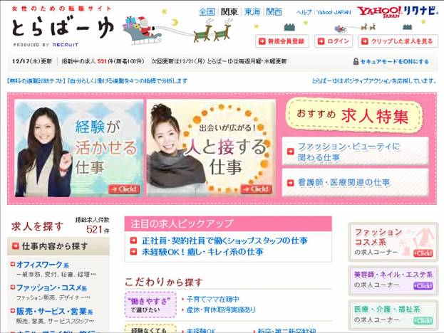 | とらばーゆのTOPページ内に「転職サポートコーナー」として「働く女性の声」や「働く女性500人のマネー事情」 「働く女性のON&OFFサポート」など女性ならではのコンテンツを取り入れています。 |