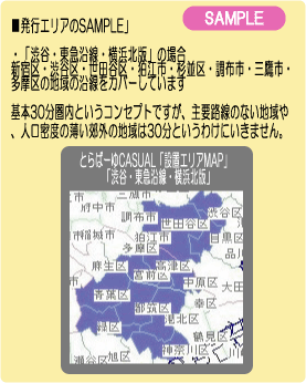 とらばーゆカジュアルは首都圏11版を発行しています。電車の路線や乗り合わせなどを考えて、効果的に読者にリーチできるエリア分けをしています。発行部数は11版で約1万部ですので、概ね1版あたり9,000部の発行ということになります。 |