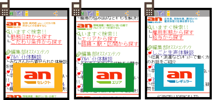 | webanは一回の申込で、WEBサイトだけでなく携帯端末版求人サイトにも同時掲載されます。 又、モバイルサイトは4キャリアで公式サイト化しており、WEBとモバイルから求職者に確実アプローチします。 anセレクト、anレギュラー、anエリアそれぞれのモバイルサイトに転載されます。 | |