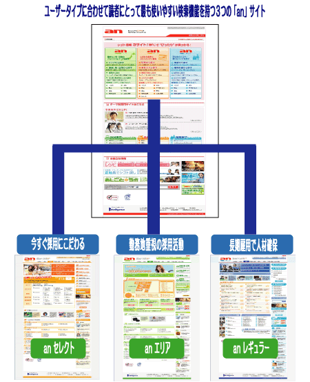 ■ウェブアンは多様化するユーザーにマッチングさせるため、web anのなかでターゲットっを3つに分けたサイト作りとなっています。 |